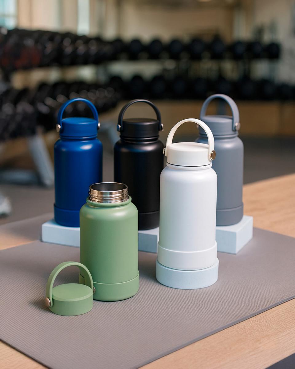 Garrafa de vidro jateado bicolor, capacidade de 470ml. Contém alça de silicone.