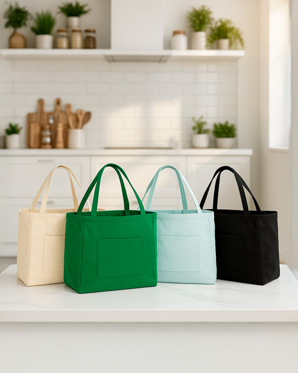 Sacola 100% algodão (180 g/m²) com malha 100% algodão (100 g/m²) na parte frontal. Alças em webbing com 65 cm. Sacola ideal para compras. 390 x 430 x 80 mm