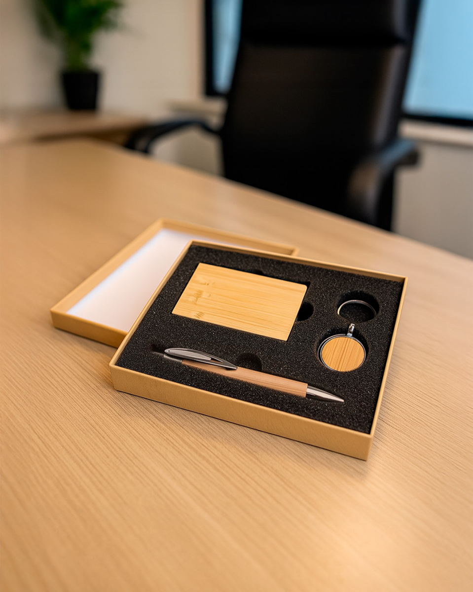 Esferográfica em bambu e ABS com acabamento metálico mate. Possui mecanismo twist e clipe em metal. Esferográfica amiga do ambiente. Escrita em azul. A cor e o resultado da impressão nos materiais naturais pode variar entre produtos. Ø10 x 142 mm